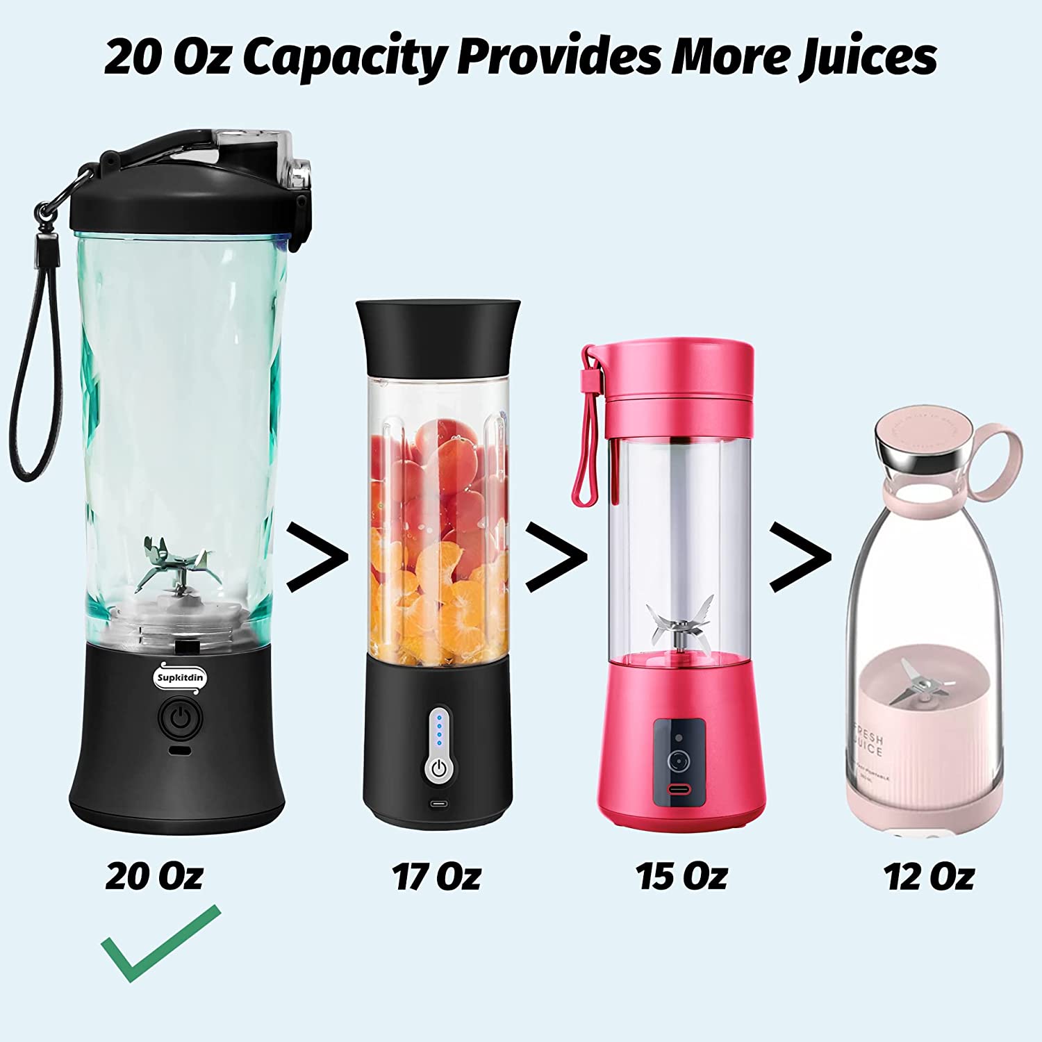 - 【20 Oz Larger Capacity】After studying the market of portable blenders, we found out the majority of them come with the capacity of 12, 13.5, 14, 15, 17 Oz, which fail to produce adequate juices to meet personal need,as a result, users have to blend again and again; So we make this new personal blender with larger capacity of 20 Oz(600ml),only single one blending could provide enough juices for one person.