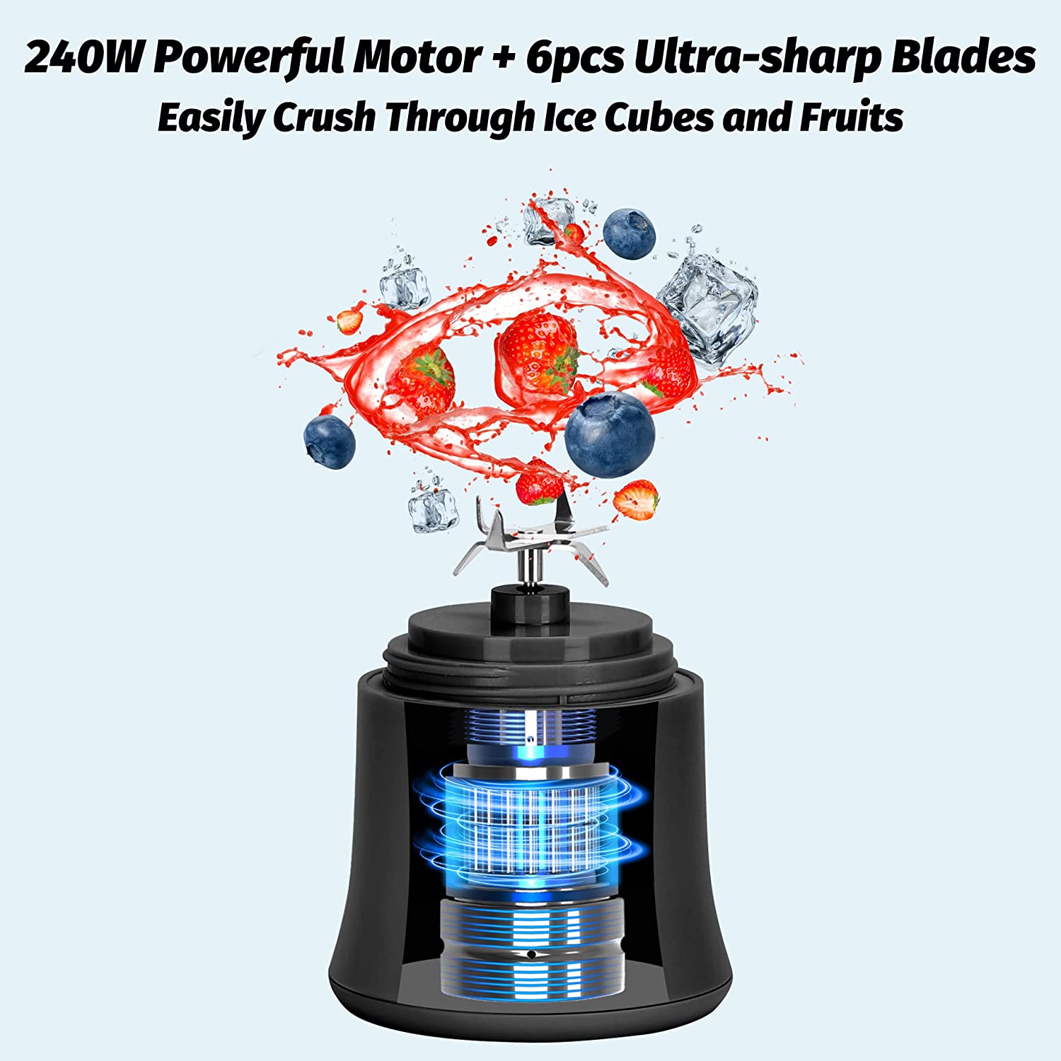- 【240W Powerful Smoothie Blender】We made lots of test to improved the structure of the stainless steel 3D blades to make them less likely get stuck by fruits or vegetables during the blending process. Meanwhile, we equip this smoothie blender with 240W high speed motor with a rotating speed of 24,000 times per minutes, it can easily crush through SMALL ice cube and frozen fruit, bringing you a cup of smoothie or juice within 30s!
