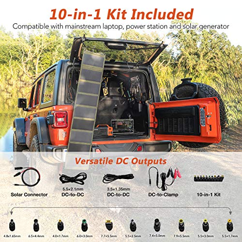 - ☀️ HARNESS THE POWER OF THE SUN: The AIMTOM 60W folding solar panel is here to help you take advantage of the sun’s unlimited power and help you power up your laptop, iPhone, camera, wireless speaker, portable power station or solar generators. Charge your laptop directly from sunlight with the 10-in-1 connector kit (except for MacBooks). MC-4 cable, DC-to-Clamp, DC-to-DC cables are also included.