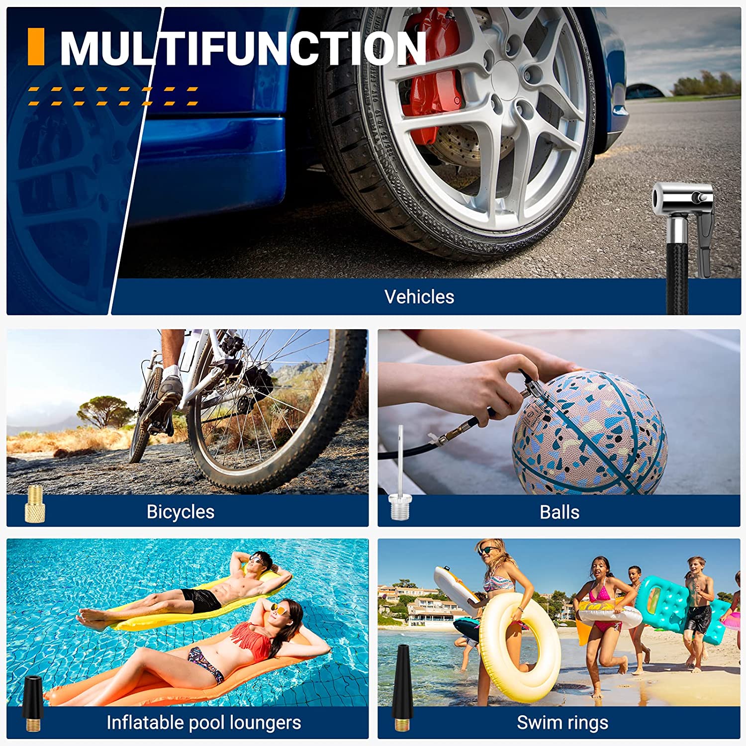 - WIDE RANGE OF APPLICATIONS: 3 Nozzles and Extra Fuse Included. Inflates any Schrader valve on cars, SUVs, motorcycles, and bicycles; the included accessories quickly inflate balls, air pillows, cushions, balloons and mattresses. NOTE: This pump is NOT intended for use with high pressure or large volume applications like pools and Inflatable canoe