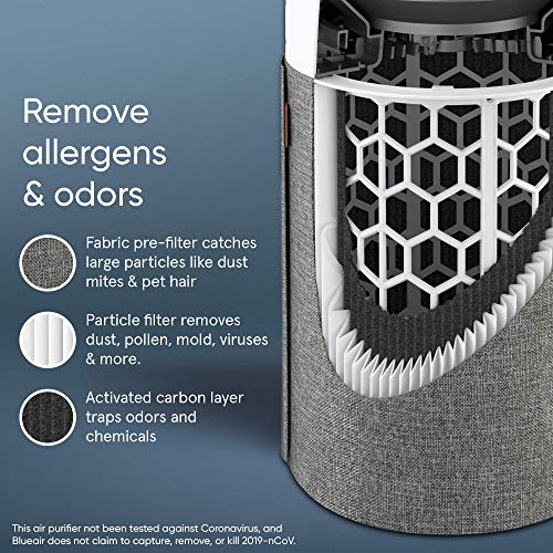 The Blue Pure 311 Auto air purifier takes a simple approach to smart air quality management with an integrated particle sensor, Auto mode setting, and LED air quality display. The air purifier delivers high performance with one-button control and customizable pre-filter colors in a lightweight, compact package. Independently evaluated and third-party tested for performance as part of the AHAM Verified Program for room air cleaners, this air purifier has a Clean Air Delivery Rate (CADR) of 250 for fine smoke particles, 250 for pollen particles, and 244 for dust particles. Removes 99%* of fine particles from wildfires; *in 60min. Tested on PM 2.5 (GB/T 18801-2015). Recommended for medium rooms like a master bedroom, living room, or playroom with a 360° air intake to completely filter room air about every 12.5 minutes (4.8x an hour at 412 ft²) on the highest speed. The 3-step combination particle plus carbon filter works with Blueair’s HEPASilent filtration technology to remove 99.97percentage of airborne particles down to 0.1 microns, like pollen, dust, pet dander, mold, bacteria, viruses and more, while an additional layer of activated coconut carbon traps light household odors. The one-touch enabled Auto mode is designed to help you maintain a comfortable and safe home environment. When enabled, the setting automatically adjusts to real-time conditions reported by the integrated particle sensor. Stay up to date on your air quality with the LED display, it changes color to indicate good, moderate, or poor. The Blue Pure 311 Auto cleans the air with noise levels equivalent to a soft whisper on low (30-52 dB), and ENERGY STAR rated energy efficiency (7-35 W). Change color in seconds with five fabric pre-filter options inspired by Scandinavian nature. The fabric material of the pre-filter catches larger particles and extends the life of the primary filter. Plus, a hidden compartment in the fabric pre-filter keeps the power cord hidden out of sight. Vacuum the fabric or toss it in the washing machine whenever it needs cleaning. Pre-filter in Arctic Trail (gray) included, Additional colors available for purchase. At Blueair, our Swedish heritage inspires sustainability and quality at the heart of everything we do. All Blueair purifiers are AHAM Verified for Clean Air Delivery Rate (CADR) and given a recommended room size, ENERGY STAR rated, and tested by the California EPA Air Resources Board (CARB) for safe ozone emissions. This air purifier not been tested against Coronavirus, and Blueair does not claim to capture, remove, or kill 2019-nCoV.