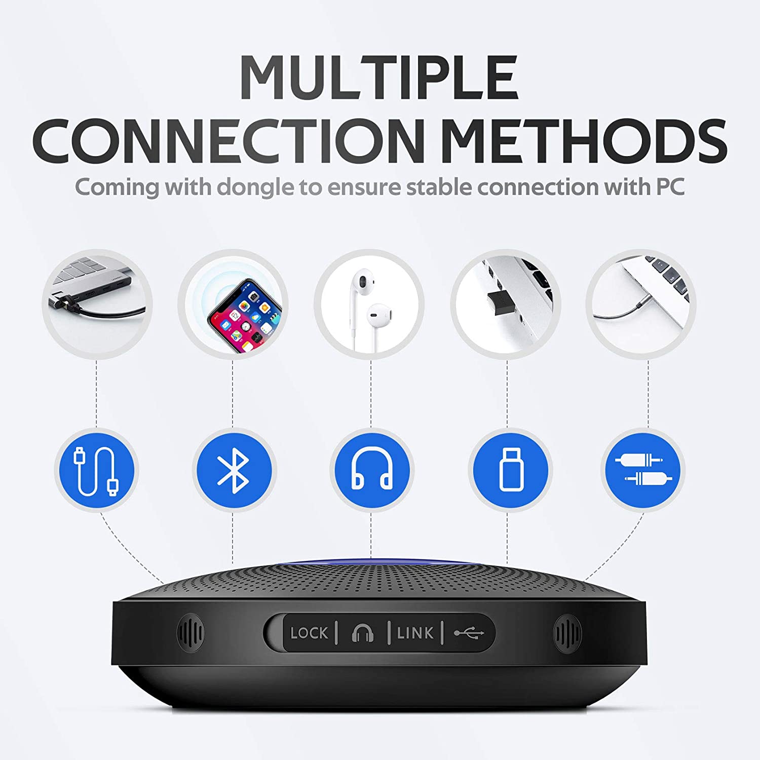 - Multiple Connection Methods & High Compatibility: USB, Bluetooth, AUX, Dongle Connection are all your choices. When connected through USB, Bluetooth conference speaker can be turned on automatically, offering users better using experience. It is also compatible with various platforms, including Zoom, Skype for Business, WebEx, Goto Meeting, Google Hangout, Facetime and etc. No matter Win7/8/10 or Mac OS could be easily connected with this conference speaker and microphone.