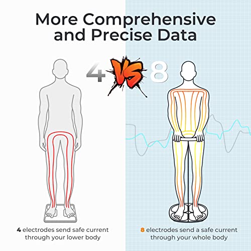 - Industry Leading Accuracy: 8 revolutionary sensitive electrodes and 4 high-precision sensors ensure precise and accurate measurement levels in comparison to other, traditional 4-electrode type products. The measurement range includes 0.4 lb-396 lb (0.2kg-180kg), 0.1 lb to 0.2 lb weight increments. This amazing product offers you precise body measurement techniques that help you achieve better health goals.