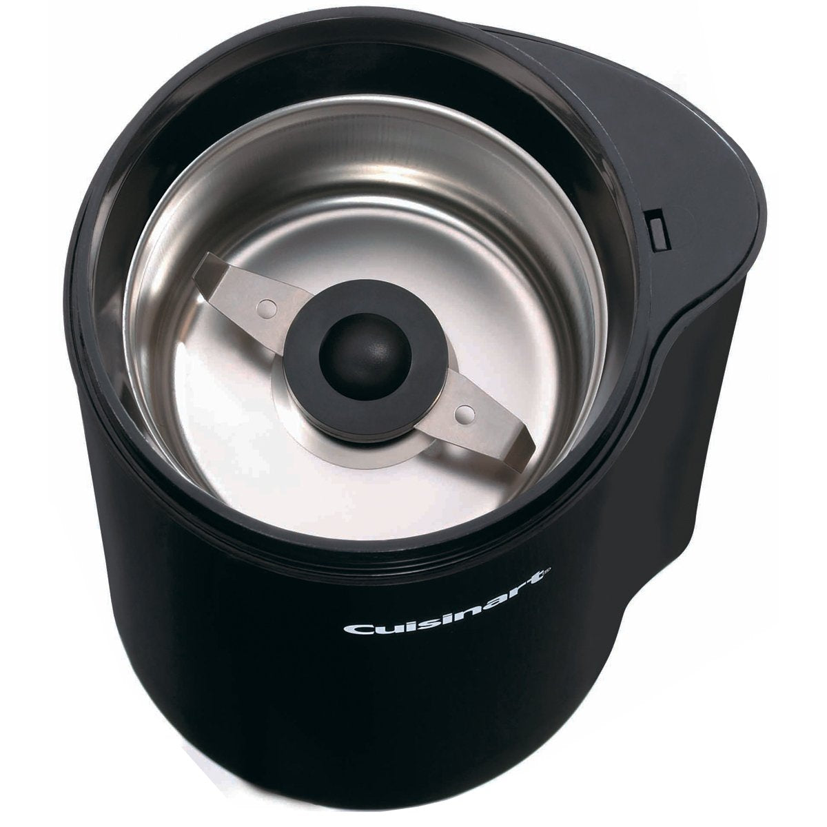 With Cuisinart's handsome, compact coffee grinder, it's easy to always have fresh coffee made to exact specifications. It has a 2-1/2-ounce capacity--enough for 12 cups of coffee. The grinder's clean lines and teardrop shape make it easy to hold, and it runs with the push of a button. To use, simply measure coffee beans into the bowl, replace the lid, and hold down the button until the coffee is ground to the desired consistency. Both the bowl and blades are made of stainless steel. Unplug the grinder when it's not in use--the cord can be stored in the base of the unit. --Jennifer Harris