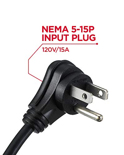 - 12 NEMA 5-15R OUTLETS: Six battery backup & surge protected outlets; Six surge protected outlets (Three ECO controlled); INPUT: NEMA 5-15P right angle, 45 degree offset plug with five foot power cord