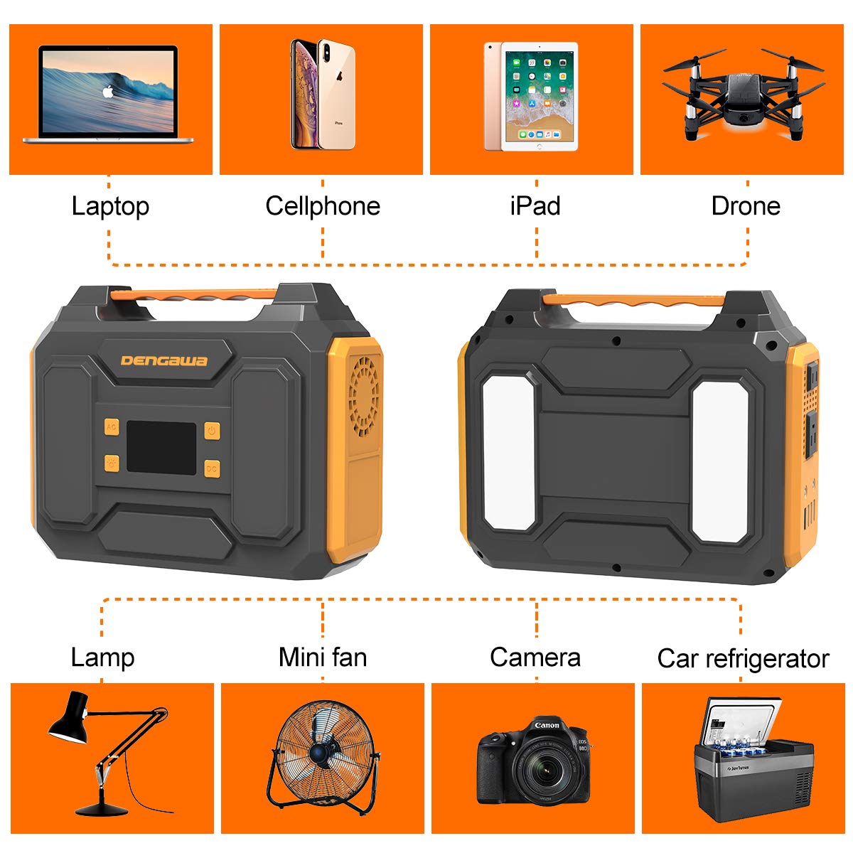 - PORTABLE POWER STATION: DENGAWA R200 portable power pack has a huge capacity of 250 watt-hour (67,500mAh, 3.7V), It can easily meet all electrical needs of your devices which less than 250W. It will fully charge laptops > 3 times, cellphones > 15 times, CPAP machine > 2 nights(by using DC converter), mini refrigerator > 3 hours.