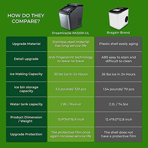 - 1 Years for Ice Maker Machine: Come with a removable ice basket, an ice scoop, a measuring cup, easily transfer the ice cubes from ice maker machine. Dreamiracle provides 1 year and 45 days return policy. Ice maker machine's stainless steel metal shell prolongs longevity, perfect for kitchen countertop, backyards, RV, restaurants, boats and more.