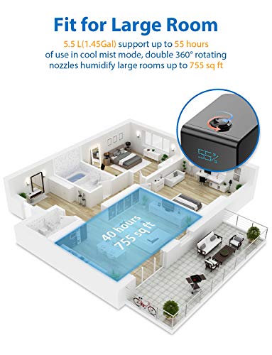 - DESIGN FOR LARGE ROOM: Equipped with a 5.5L large water tank, works up to 55 hours. no need to fill the water tank frequently. The output can reach 600 ml/h for areas up to 755 sq. ft. (Set the humidity between 40%-60% for reducing flu risks.)
