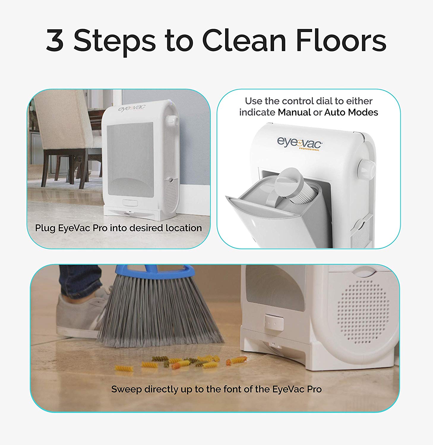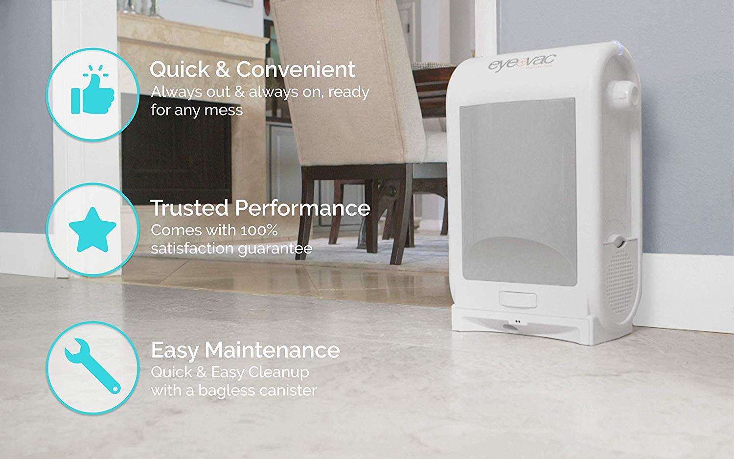 EyeVac’s high efficiency Dual Filtration removes dirt and dust molecules, returning clean air to your home and allowing you to breathe healthy.