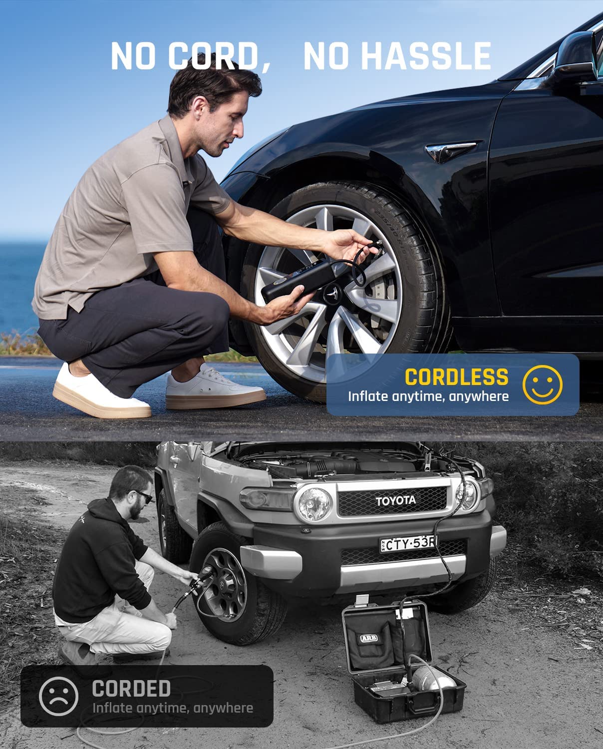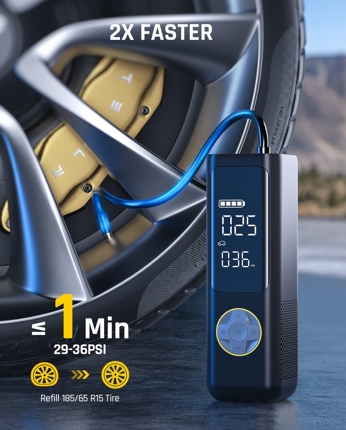 - 2X Faster 12V Cordless Tire Inflator: The powerful X8 APEX tire inflator has a built-in high-performance chip that can quickly inflate tires and provide 32L/Min of airflow. Top off 26.3" EV & Passenger Tires in Under 1 Minute (36PSI-42PSI). Take only 90s to pump up one Tesla tire (235/40 R19) from 29PSI to 36PSI; less than 6 minutes for one 205/55 R16 car tire(0-36PSI).