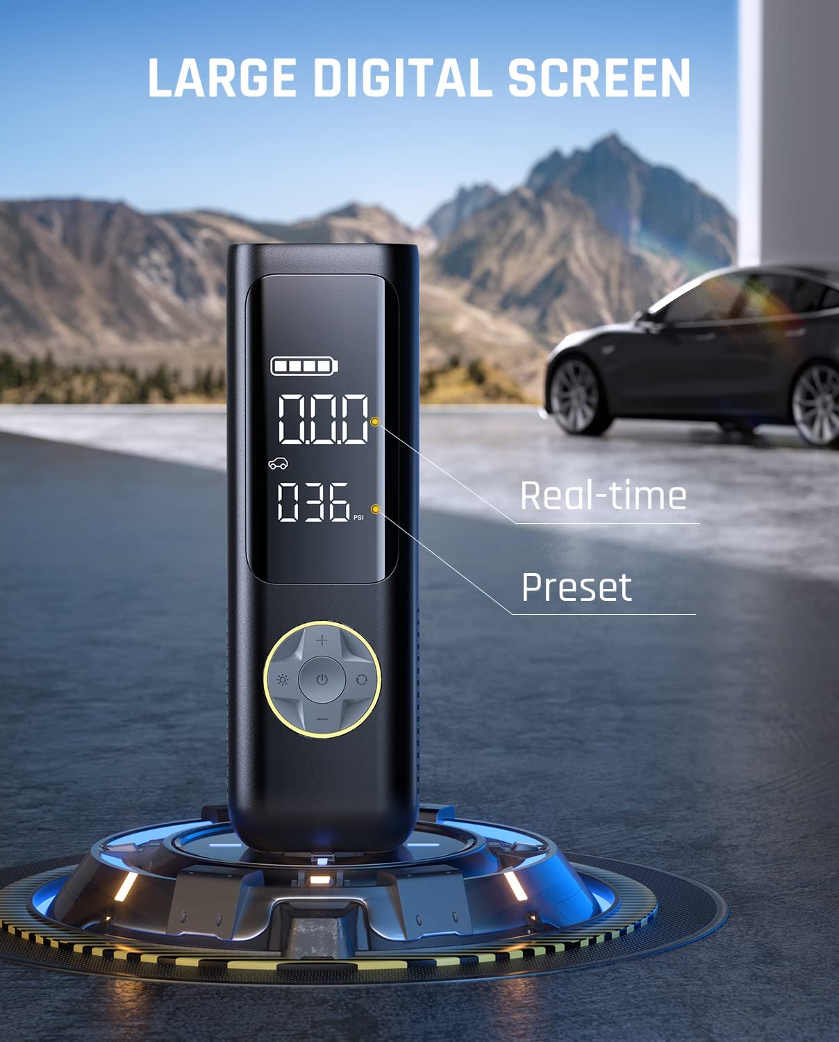 - Accurate LCD Digital Pressure: The large LCD dual display shows both real-time pressure value and preset value, convenient to read and observe the tire pressure status. With maximum pressure 150 PSI and auto-stop give you smart inflation. No need to worry about over-inflating your tire.