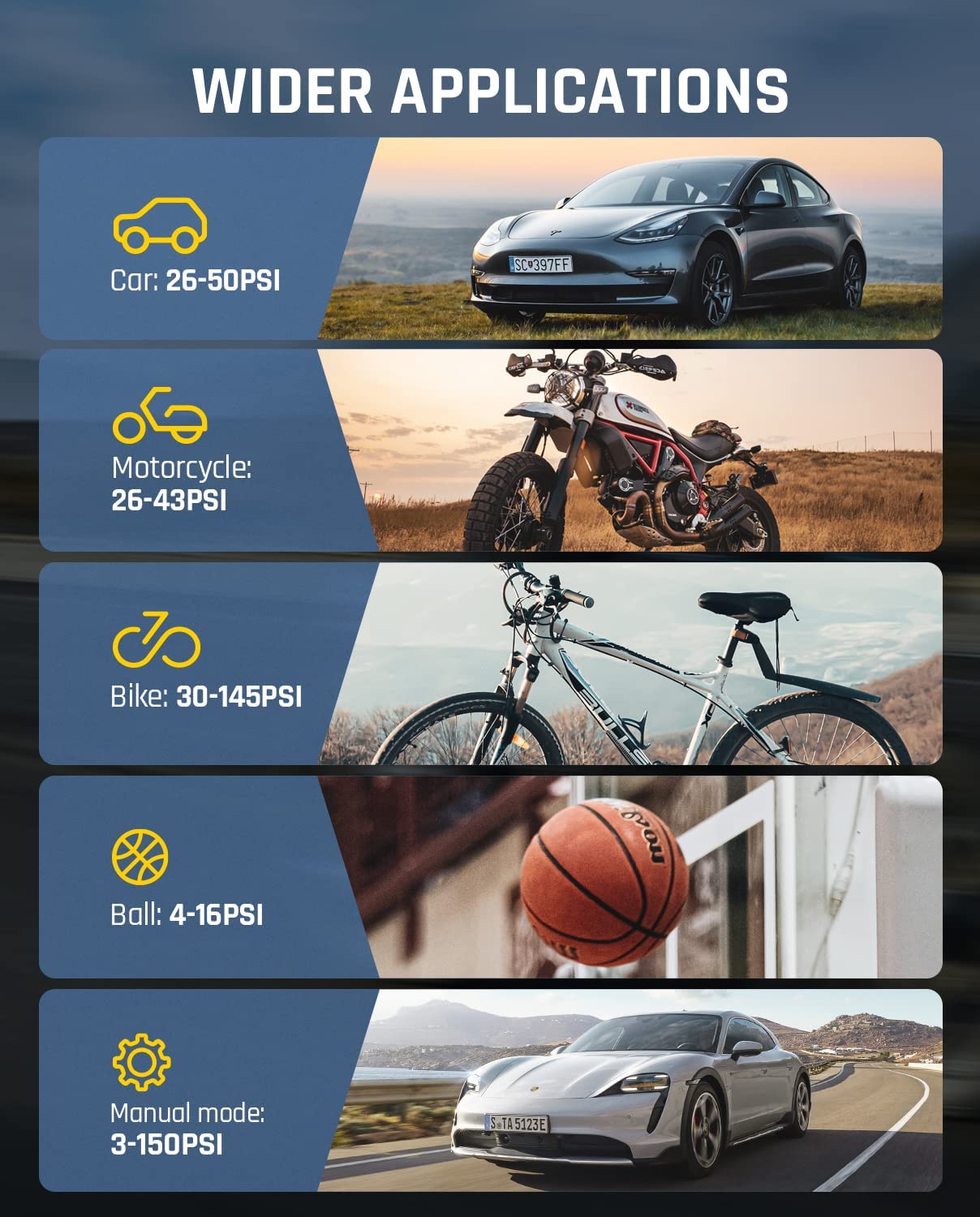 - 4+N Smart Modes: 4 types of preset inflation modes (bicycles, motorcycles, cars, and balls) are convenient for beginners to choose. The manual mode allows you to set pressure value (3-150psi) according to the inflation object. The operation is simple, easy to use and meet your various inflation needs.