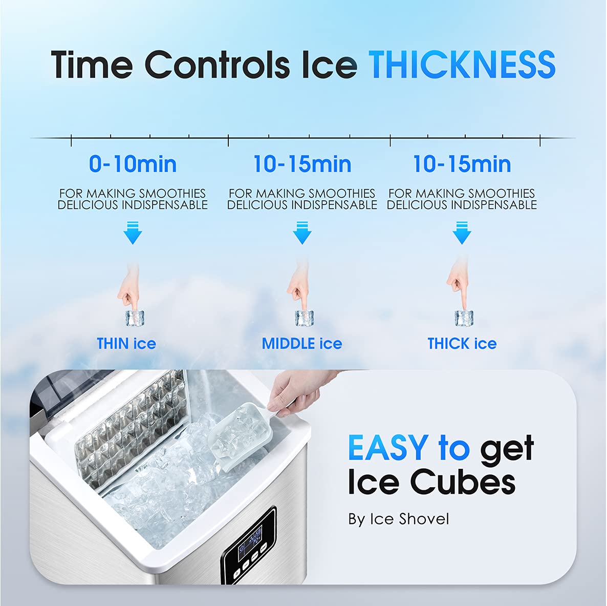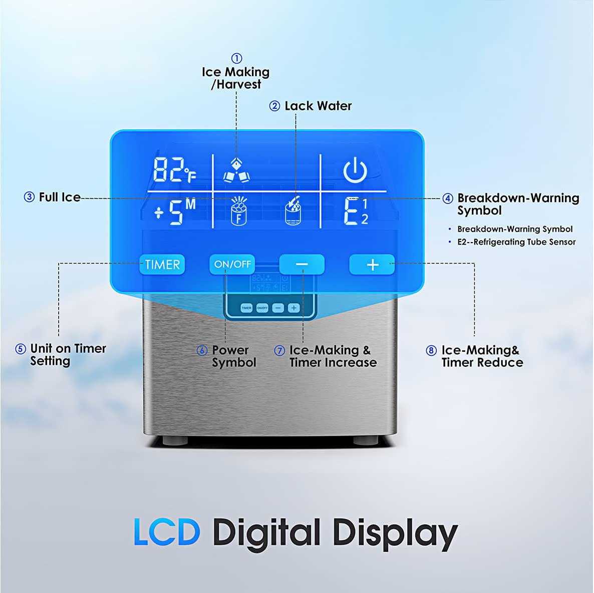 - 【LCD & DIGITAL DISPLAY & AUTOMATIC CLEANING】 - Electronic controls for ease of use. Features an easy-to-read push-button. Timer with up to 8-hour delay. Offers on-time ice production. There are WATER-SHORT and BACKET-FULL indicators.Press the "TIMER" button for more than 5 seconds to enter the automatic cleaning function. (Please clean your ice machine regularly)