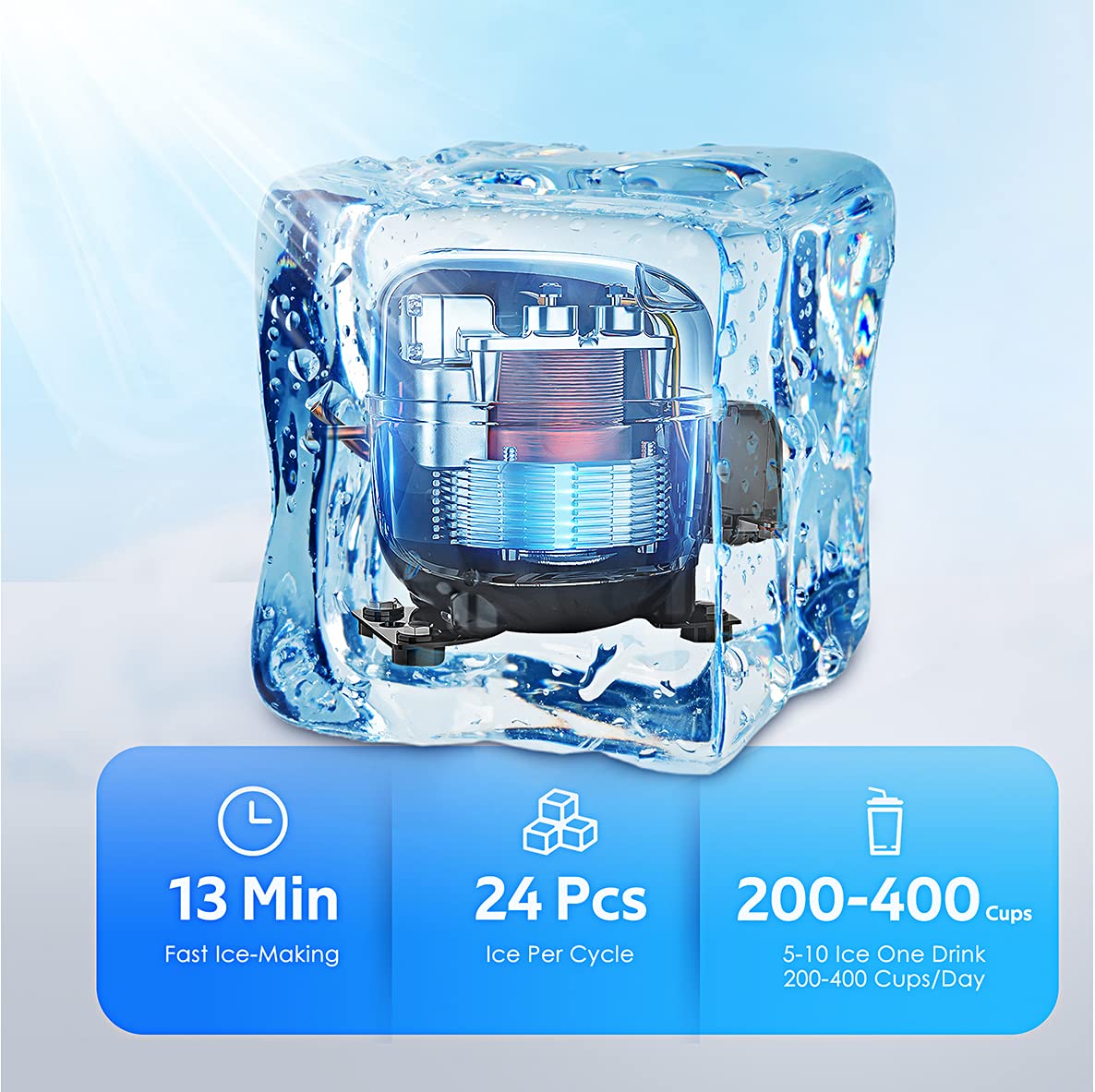 - 【24 ICE CUBES IN 13 Mins & 40LBS EVERY 24HRS -】 FREE VILLAGE’s countertop ice maker machine can produce 24 ice cubes per cycle (every 13 to 18 minutes). That means you can make up to 40 pounds of ice cubes every 24 hours. Best of all, you can adjust the thickness of the ice cubes according to your needs, letting you create perfect drinks.