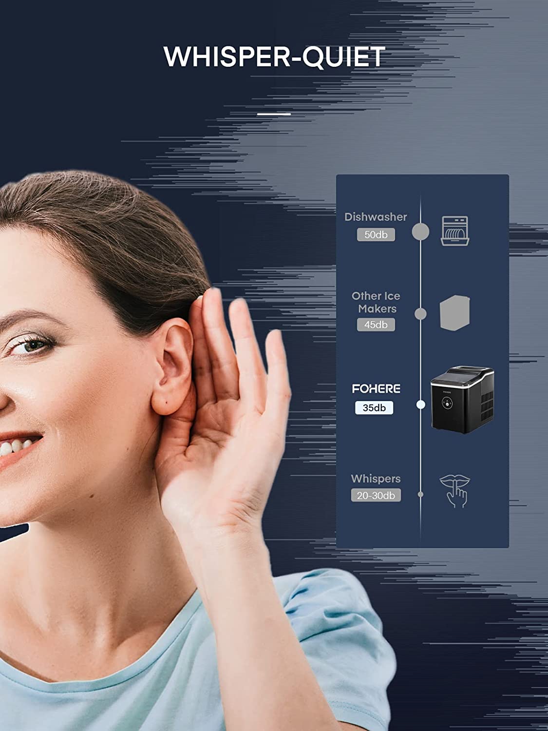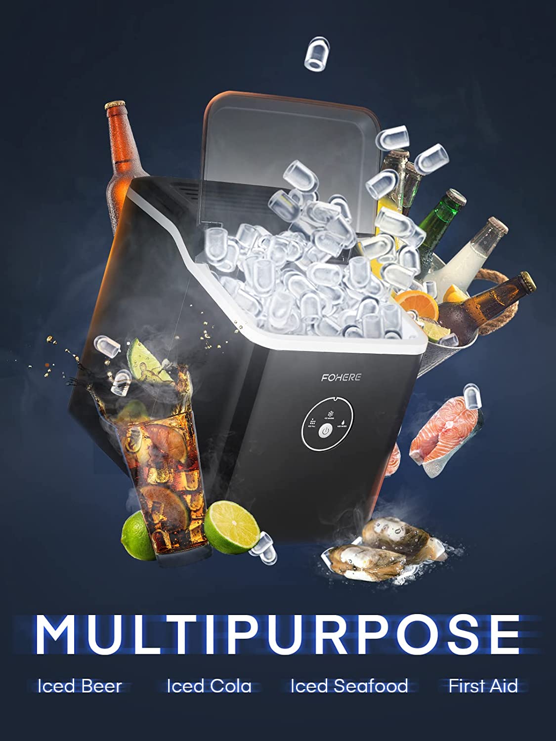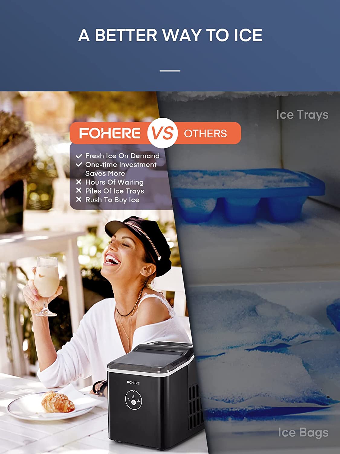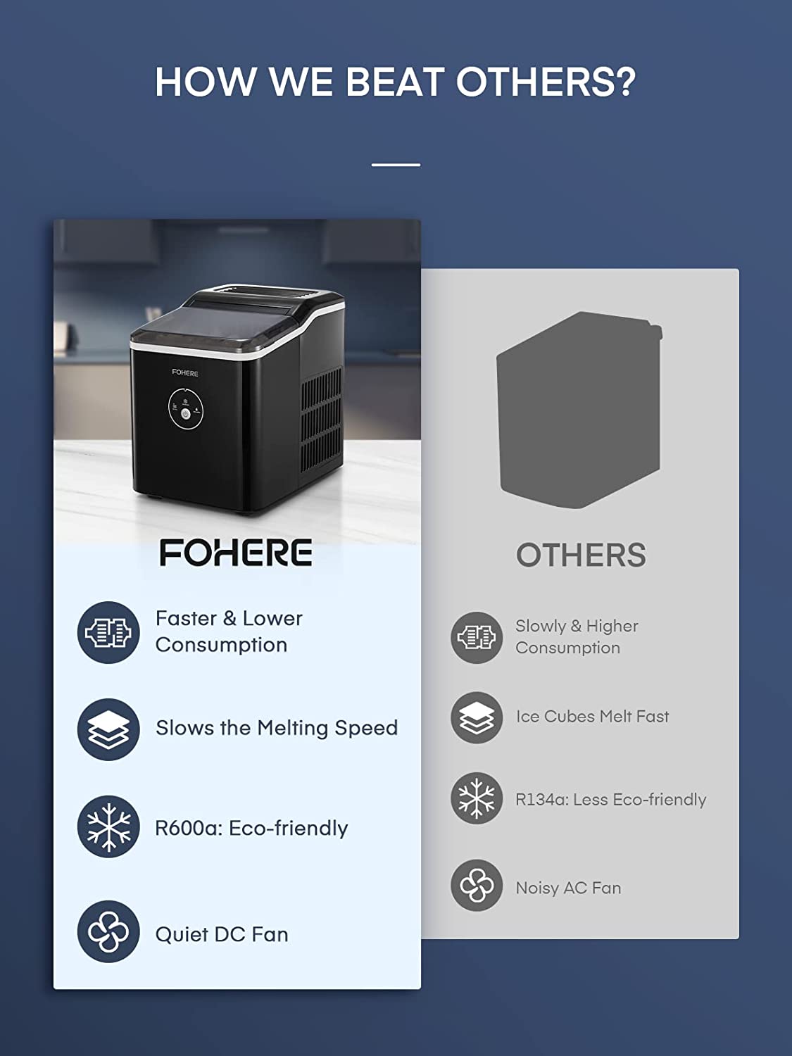 - Lower Consumption - FOHERE ice maker makes 28 lbs of ice per day and costs 3.6 kWh. Choose FOHERE ice maker to keep energy costs and the carbon footprint of your home as low as possible.