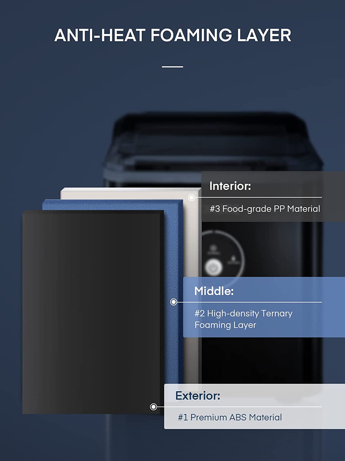 - Upgraded Features - High-density Ternary Foaming Layer isolates heat. Quiet a DC fan. Infrared Sensor, this ice machine will stop automatically when the ice basket is full or when there is insufficient water. Ice scoop and removable ice basket with a capacity of 0.8kg.