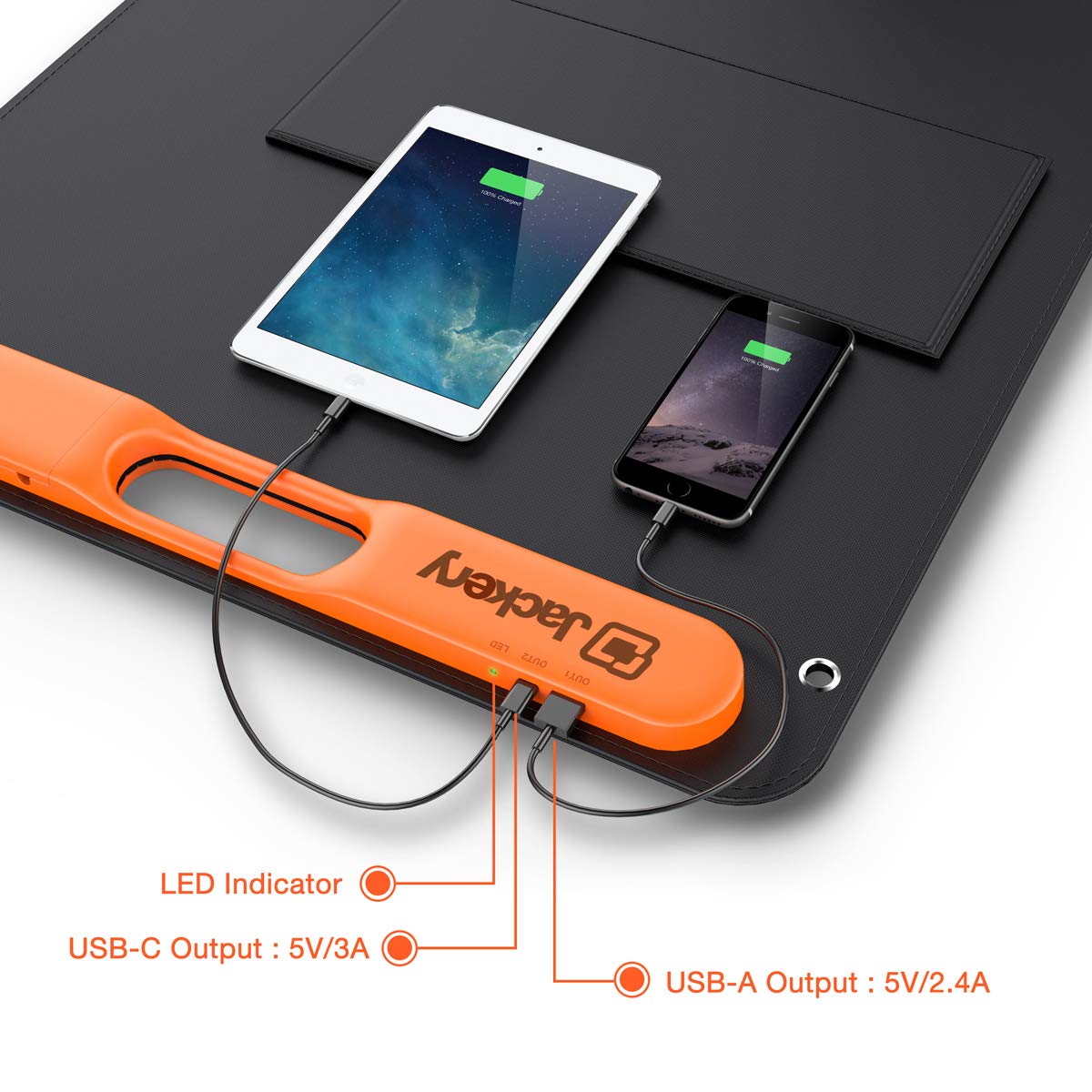 - SOLAR CHARGER WITH USB OUTPUTS: Equipped with 1* USB-C output port and 1* USB-A output port, charging multiple small devices at the same time, including smartphones, tablets, digital cameras and more.