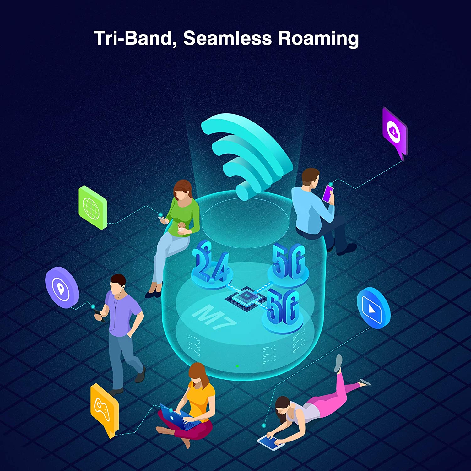 - Tri-Band Powerful WiFi: Carry more devices, automatically connects to the fastest and least-crowded network, keep high performance even in high Internet traffic use case.