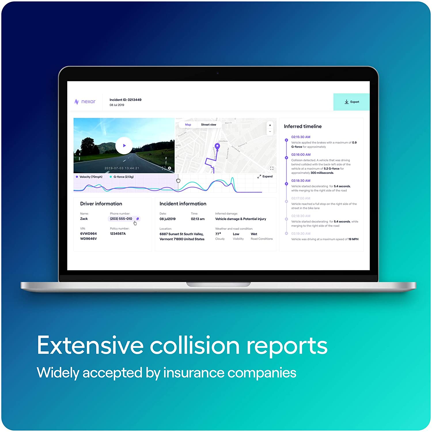 - 【One Tap Insurance Report】At the tap of a button, Nexar can create detailed post-collision reports that save you time, money, and unnecessary stress when dealing with insurance claims. Nexar’s report summarizes key information from the crash, including video footage, driving speed, G-force impact, and location.