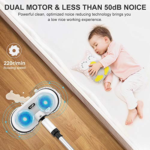 - DUAL MOTOR, POWERFUL CLEAN: Cordless electric mop enables you to clean the entire house without the cord-length limitation. It has high-powered dual-spin motors clean up to 260r/min, which will automatically push the mop head forward so you can remove dirt from your floor by a single hand without any effort, keep your kitchen, living room and dining room spotless.