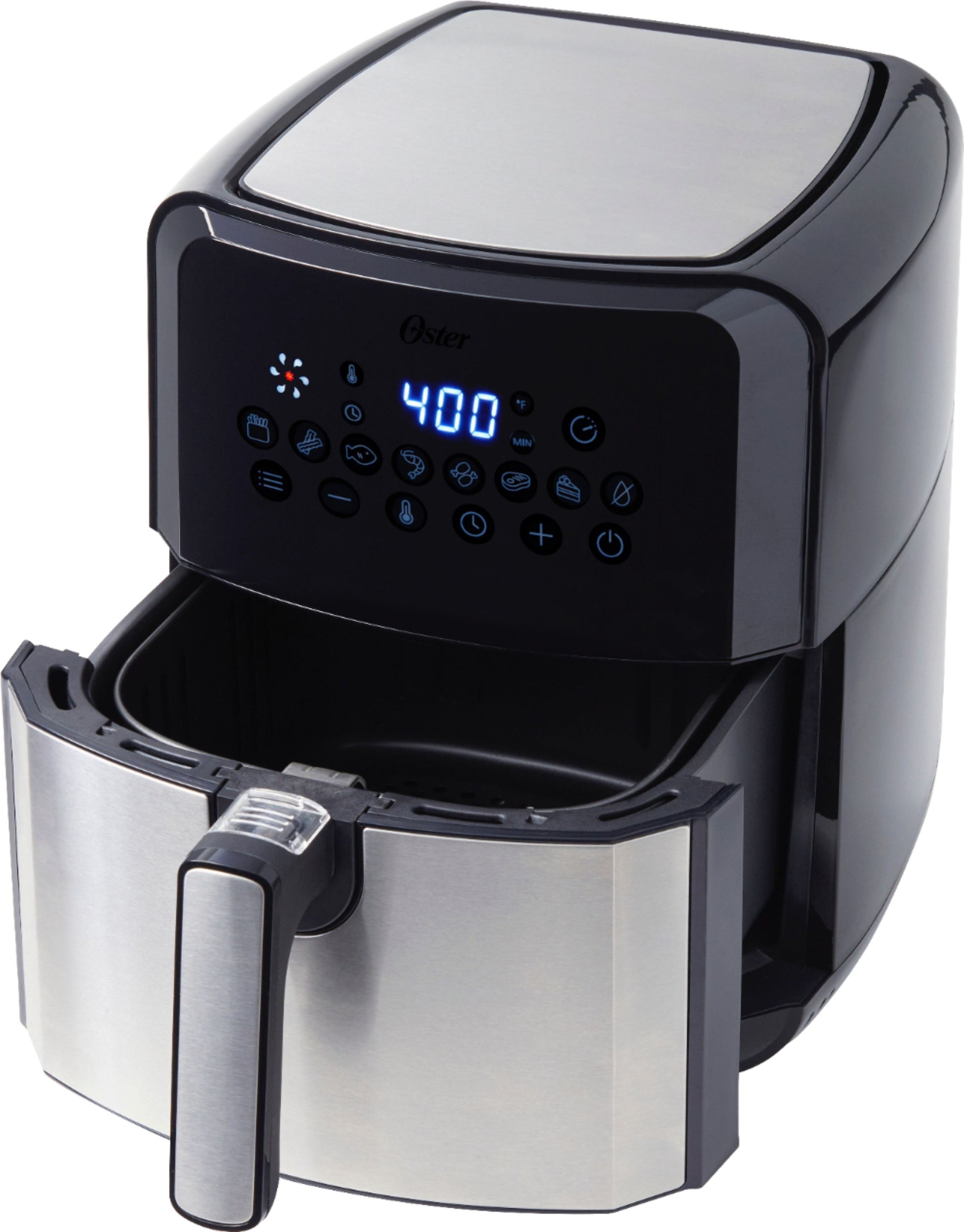 This extra-large 5 quart digital air fryer features Oster DiamondForce nonstick coating, Oster's longest-lasting nonstick yet. DiamondForce Nonstick is infused with diamond particles that form a structural matrix, creating a stronger coating to provideeasy food release and superior nonstick performance over time. This Oster air fryer has a digital display and 8 preset functions including Fries, Chicken, Fish, and Dehydrate, so you can easily make all your favorite meals, with 99.5% less oil than deepfrying (compared to 4L-capacity deep fryers). It offers an extra-large capacity, detachable frying basket, overheat protection, and nonslip feet. And the PFOA-free, diamond-infused nonstick surface means hassle-free cleanup.