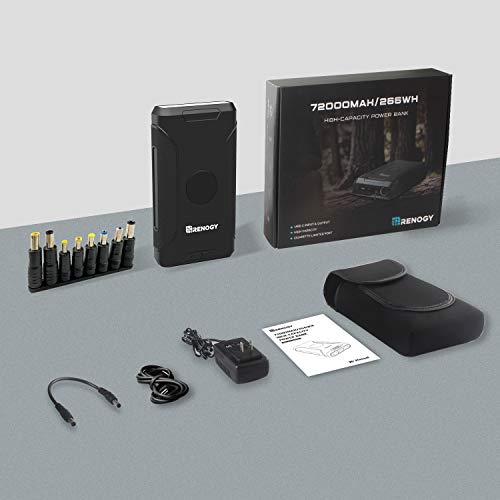 Power Beyond ImaginationThe new Renogy 72000mAh/266Wh Power Bank in 2021 brings in more cutting-edge charging technologies to deliver both performance and convenience.Born for SpeedEquipped with power delivery, the two USB-C ports are built to ensure fast and optimal charging experience so you can have more time for entertainment.Note: the USB-C (1) port does not support gaming laptops. Ready for CPAPWant to have a sound sleep at campsites where there is no access to wall outlets? Bring this little beast with you and it can pump efficient power from the 12V/ 15A cigarette lighter port for most CPAP machines.Note 1: we kindly advise you to turn OFF the humidifier and the heater on your CPAP for extented run time.Note 2: a DC to car port adapter is required to connect the CPAP machine with this power bank. Please purchase it separately.Charging for EveryoneBuilt in with two USB-C ports, a USB-A port, a car socket, a two-way DC port, this portable charger offers various charging solutions for your devices at the same time.Free from CablesWelcome to the new era of wireless charging. Lay your phone on the charging pad for an easy and fast 10W Max. power boost anytime, anywhere.Note: Does NOT support wireless earbuds, smart watches, and other low-power devices.Specifications:Capacity: Input:· DC: 18-24V/4A (84W Max.)· USB-C (1): DC5V/3A, 9V/3A, 12V/3A, 15V/3A, 20V/3A (60W Max.)Output:· DC: 12V/5A, 16.5V/4A, 20V/3.5A, 24V/2A (72W Max.)· Cigarette lighter: 12V/15A Max· USB-A: 5V/4.5A, 4.5V/5A, 9V/2A, 12V/1.5A · USB-C (1): DC5V/3A, 9V/3A, 12V/3A, 15V/3A, 20V/3A , 60W Max per port · USB-C (2): DC5V/3A, 9V/2A, 12V/2.25A (PPS: 3.3-11V/3A), 27W Max per port· Wireless charging: 10WSize: 9.0 x 4.9 x 1.7 inchN.W: 3.3 lb Package includes:1 x 72000mAh Power bank1 x 40W AC adaptor1 x User manual1 x Laptop power cable (DC to DC)1 x Laptop power adaptors (8 pieces)