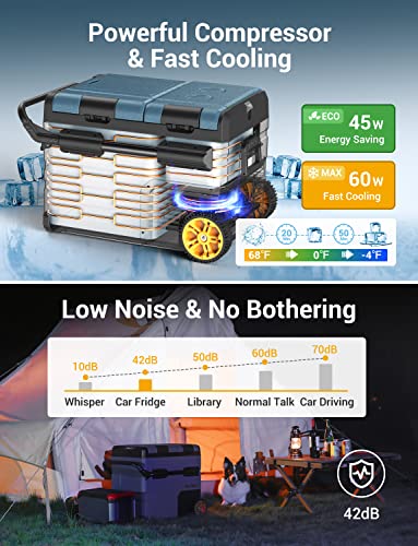 - [Anti-Shaking & Low Noise] The Rock&Rocker 12 Volt refrigerator is equipped with a multi-functional non-slip base, which can make the lateral displacent reduced. When your car is climbing at an inclination angle of 45 degrees, the 12V fridge can still run stably. The low noise of 42db which is quiet enough for you to sleep in the car after a long drive without bothering.