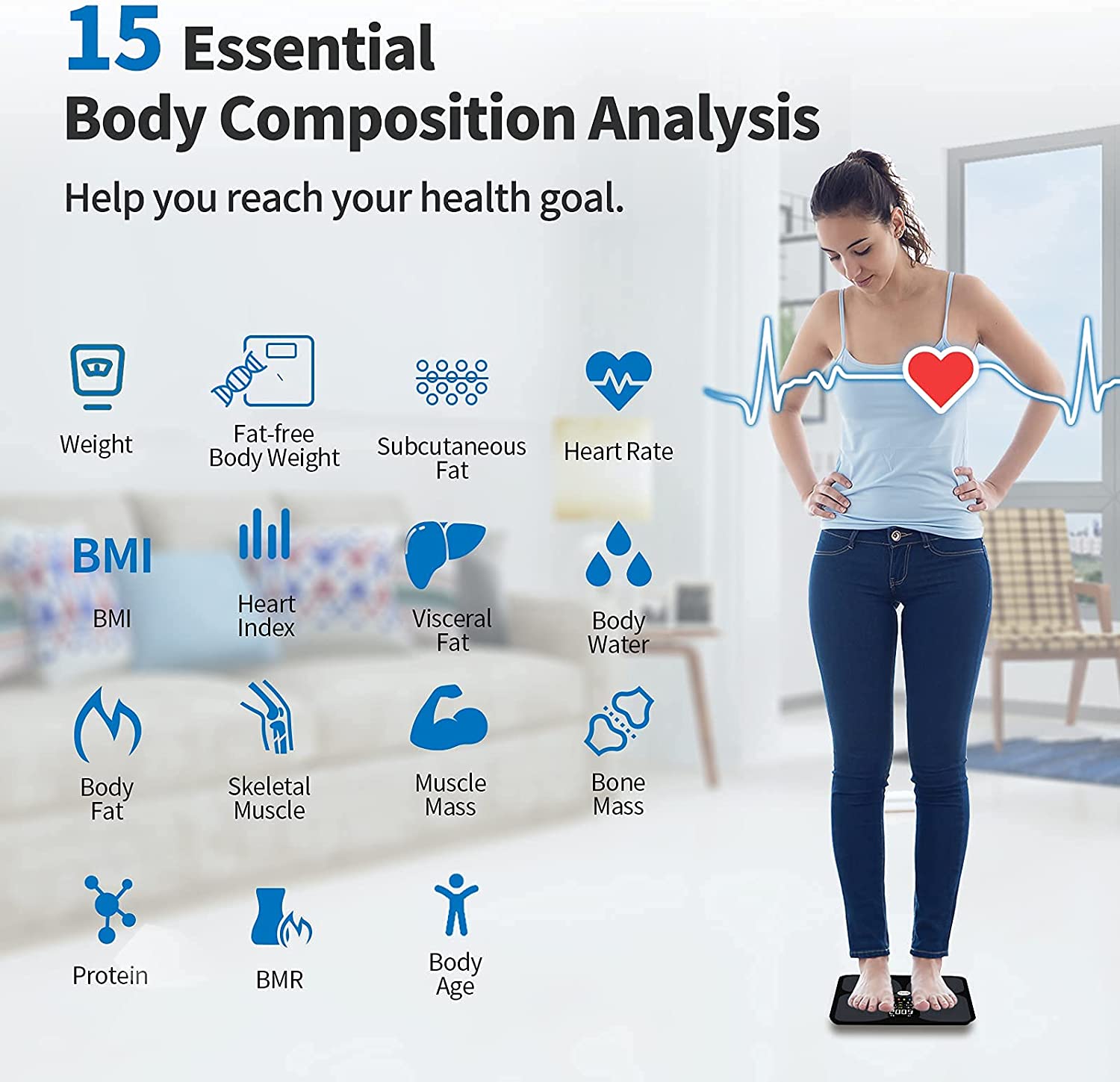 - 15 Essential Body Composition Analyzer: Scales for body weight and fat utilizes Bio-electrical Impedance Analysis to calculate 15 body composition measurements, including Weight, BMI, Body Fat, Fat-free Body Weight, Subcutaneous Fat, Heart Rate, Heart Index, Visceral Fat, Body Water, Skeletal Muscle, Muscle Mass, Bone Mass, Protein, BMR, Body Age. This weight scale is perfect for you to track weight loss and guide you to maintain a healthy lifestyle.