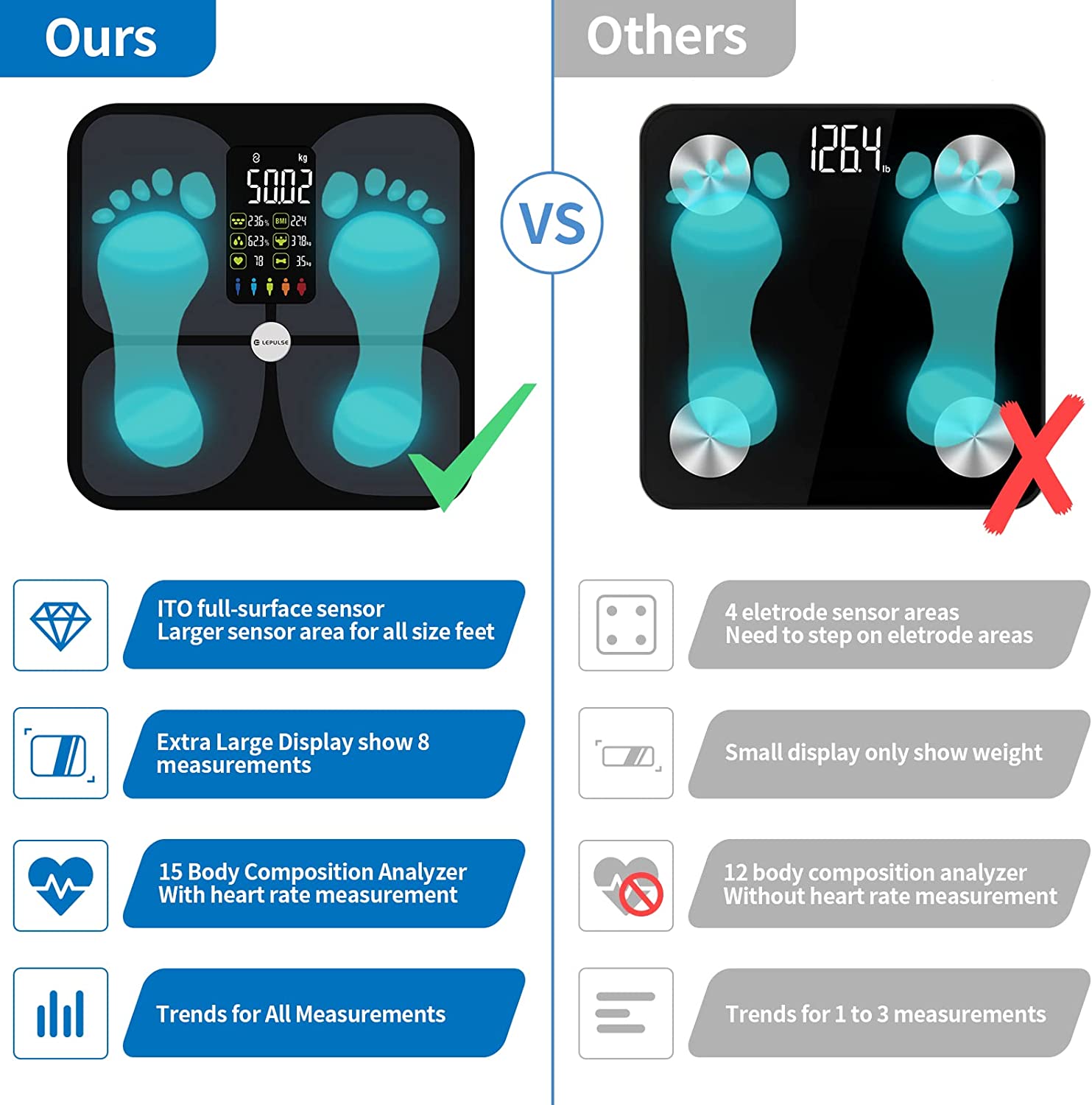 - High Accurate Digital body fat scales: Compare with other weight scales for people with 4 electrode areas, our body fat scale coated with advanced ITO tech provides much larger sensor area for for all size feet. Equipped with 4 Auto-calibrating G-shaped sensors, the scale with body fat and water weight can make the most accurate measurements of your body composition. The measurement result is accurate to 0.2lb/0.1kg. The maximum weight capacity reaches to 400lb capacity.