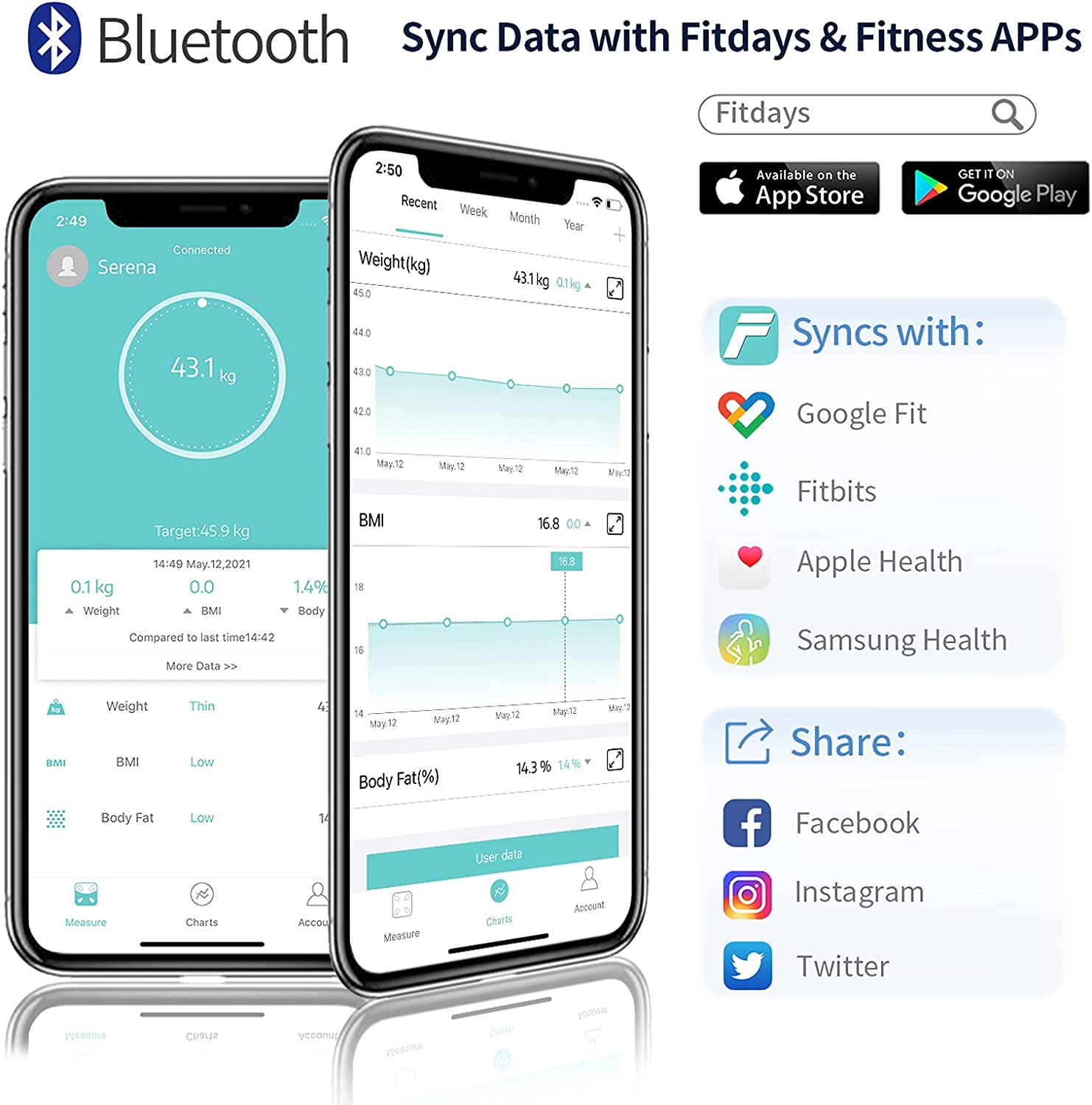 - Syncs with Fitdays APP & Fitness APPs: Download "Fitdays APP" at Apple Store or Google Play. The scale for body weight syncs the data onto your smartphone automatically via Bluetooth 4.0 BLE. The app provides detailed charts and trends of 15 body composition metrics over days, weeks, months or even years. It can also syncs data to fitness APPs like Fitbits, Google Fit, APPLE Health, Samsung Health, which means, you can use our App to track and manage your health anytime, anywhere!