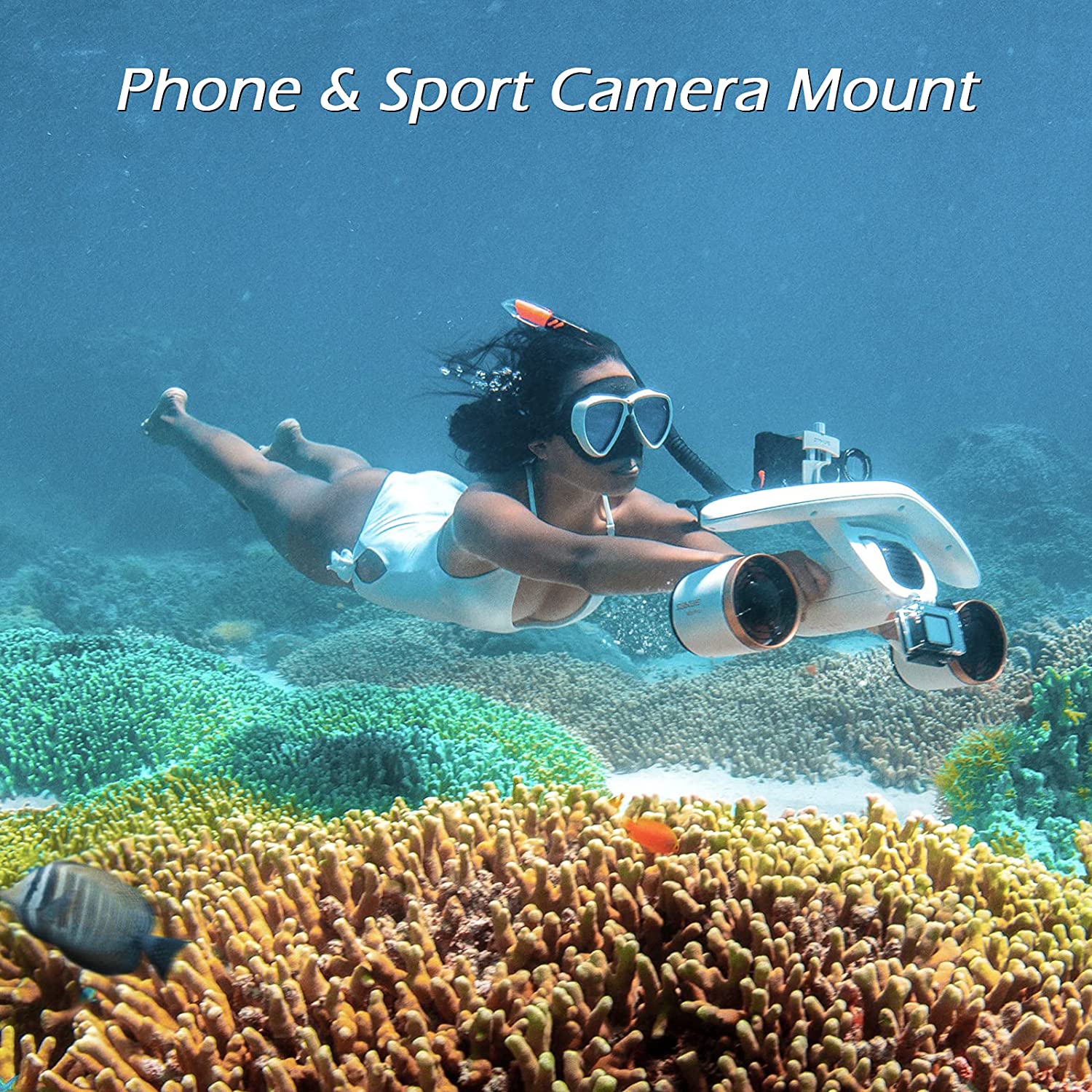 - PHONE & ACTION CAMERA MOUNT: With the newly designed built-in Phone Mount on the floater, simply bring your phone while using the WhiteShark MixPro, ready to use for all user. Capture epic moments using your smartphone by securing it onto the designated phone mount located on the floater. You can still easily attach your action camera onto the universal mount to transform into an underwater filming tool without additional cost.