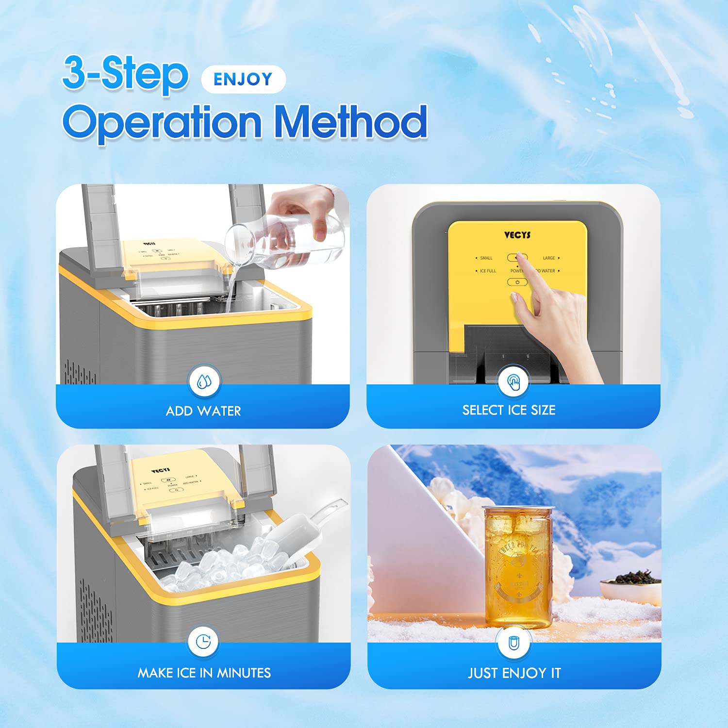 - 【Innovative Technology】Simple but excellent control system easy to operate. Automatically making ice cubes after power on, no need to babysit. Internal has the most advanced infrared sensor to avoid ice cubes overflowing and unique indicate light to remind user to replenish water in time. Besides, VECYS ice maker has self-cleaning function make it more convinient and worry-free.